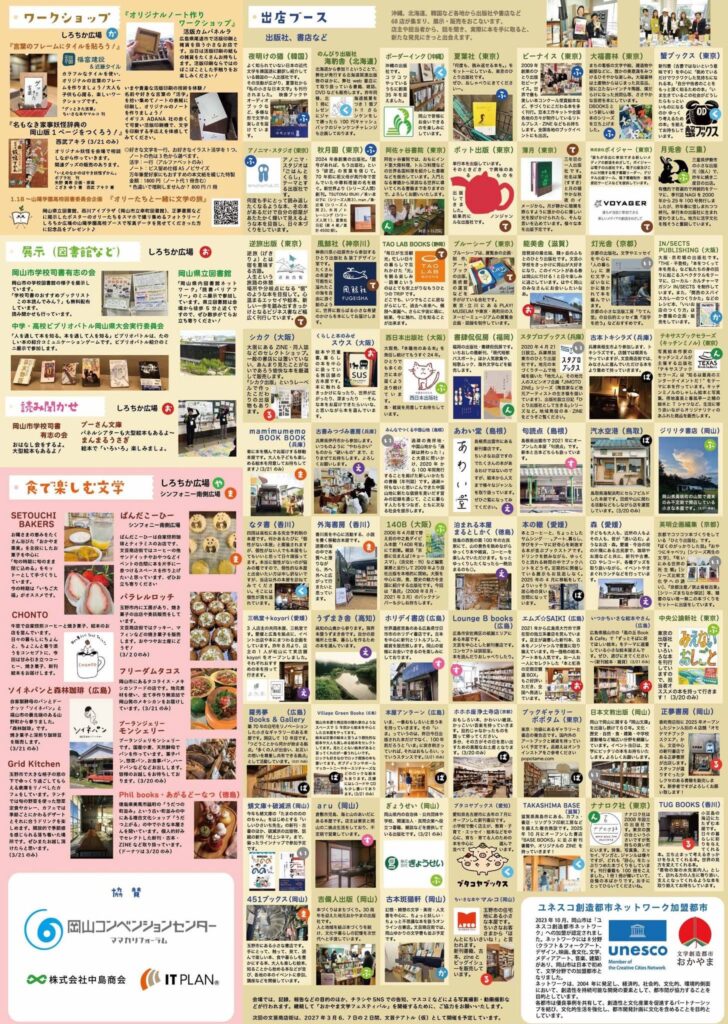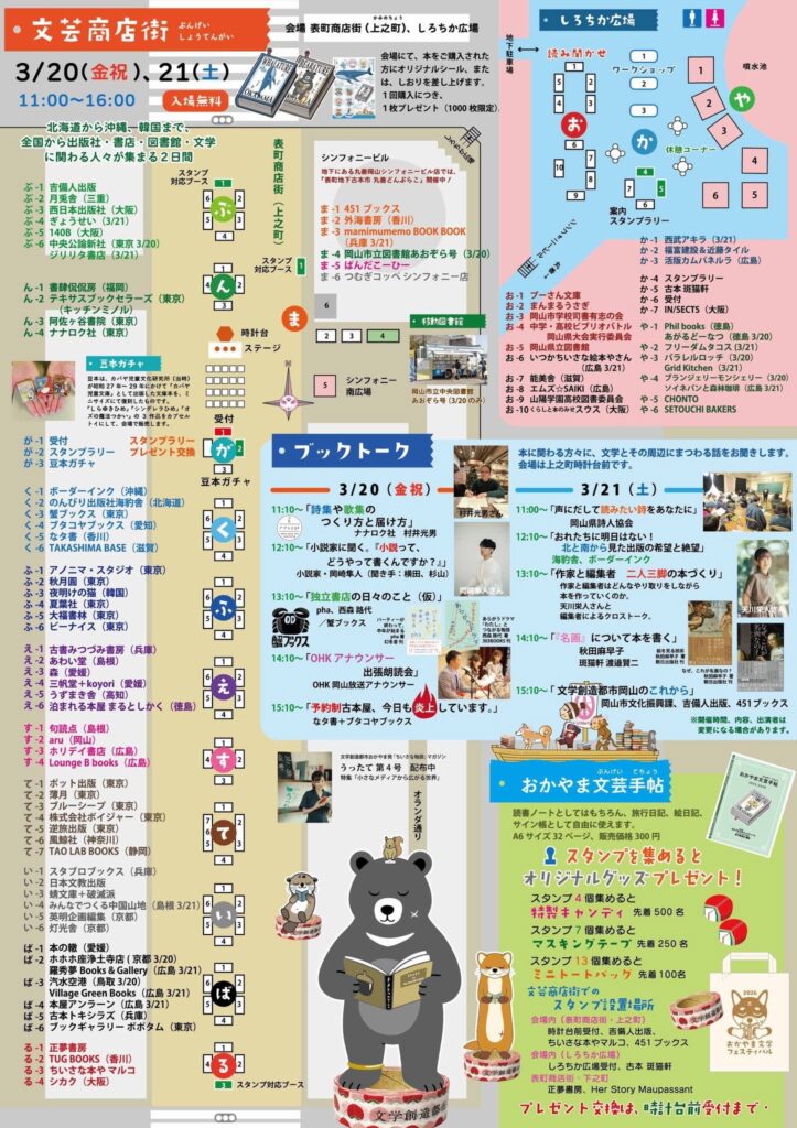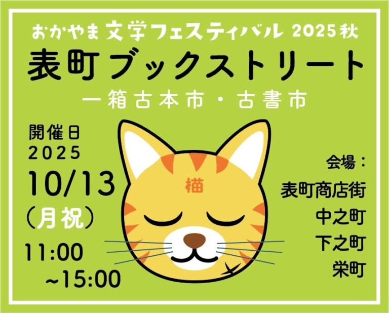 Facebook X-twitter Instagram Threads Link おかやま文学フェスティバルとは 「文学による心豊かなまちづくり」に力を入れている岡山市では、2023年から毎年「おかやま文学フェスティバル」を開催しています。2026年2月28日から始まる 2026春会期では、自分で作った小冊子などの展示販売が行える「ZINE スタジアム」、県内外の書店・出版社・飲食店の出店、トークイベントやワークショップなどを行う「文芸商店街」など文学に関わるさまざまなイベントを岡山市内各地で開催します。 新着情報 2026.3.22 おかやま文学フェスティバル今年のイベントはすべて終了しました。ご参加ありがとうございました。また秋からスタートする2026年度もよろしくお願い致します。2026.3.18 文芸商店街で購入された方に配布される栞があります!2026.3.17 文芸商店街当日マップの画像公開しました。2026.3.4 ZINEスタジアム当日お配りするマップ(裏面はブックカバーとしてお使いください)2026.1.31 第41回坪田譲治文学賞に北澤平祐さんの「ユニコーンレターダイアリー」が決定しました。2026.1.27 文芸商店街出店ブース紹介UPしました。 第三弾フライヤー 2月以降市内各所で配布していきます 連携事業「オリーたちと一緒に文学の旅」スタンプラリーについてUPしました 2026.1.20 ZINEスタジアムの出展者紹介「オリジナル」「アート」「ノンフィクション」UPしました→2026.1.3 ZINEスタジアムの申込が定員に達したため締め切りました。2025.12.30 おかやま文芸手帖のスタンプを集めてもらえるミニトートバッグができました →2025.11.11 第二弾フライヤー 11月13日以降市内各所で配布していきます。フライヤー拡大2025.10.5 (イベント終了)表町ブックストリート当日マップを公開しました。2025.9.23 表町ブックストリート「一箱古本市出店者紹介」と「古書市出店舎紹介」ページUPしました。2025.9.17 「初心者さんのための一箱古本市案内」UPしました。→2025.9.12 おかやま文芸手帖発行されました。文芸手帖についてはこちら 2025.8.17 第一弾フライヤー 22日以降市内各所で配布していきます。フライヤー拡大2025.7.11 おかやま文学創造ラジオ、開設しました。おかやま文学創造ラジオnote2025.5.22 おかやま文学フェスティバル実行委員会を発足しました おかやま文芸手帖 2026年に41回目を迎える坪田譲治文学賞、全国でも有数の貸出数を誇る図書館、公立小中学校学校司書の配置率ほぼ 100%の岡山で、おかやま文学フェスティバルをさらに盛り上げるために、このたび文芸手帖を作成しました。文芸手帖は、読書ノートとして利用できるようにデザインしていますが、スタンプ帳、絵日記、サインとしても利用できます。使い方は自由です。この手帖を手にした人が小さな物語を記録することから、豊かな時間が生まれていくことを願っています おかやま文芸手帖について おかやま文芸手帖のスタンプを13個集めるとミニトートバッグを差し上げます!受け取りは3月8日のZINEスタジアムと3月20日21日の文芸商店街の3日間(各日先着100名様)です。ぜひ集めてイベント受付でお受け取りください。スタンプ4個で「キャンディ」7個で「マスキングテープ」を差し上げます。 「天川栄人講演会」 学校図書館カフェ・スペシャル!「作者の思い×学校図書館」 (イベントは終了しました) 日時: 2025年10月5日(日曜日)14時から16時会場: 岡山県立図書館 2F多目的ホール内容:『おにのまつり』『わたしは食べるのが下手』『ぼくたちの卒業写真』 など児童文学・ライトノベル作家として活躍している天川栄人さんの講演主催:学校図書館を考える会・おかやま、岡山市、岡山市文学賞運営委員 表町ブックストリート 2025年10月13日 於:岡山市表町商店街(中之町・下之町・栄町)内容:一般公募の出店者による一箱古本市/古書店による古書市 (イベントは終了しました) 表町ブックストリートマップ 当日マップ裏面ブックカバーになります 2025一箱古本市出店者紹介 2025古書市出店者紹介 「初心者さんのための一箱古本市案内」、一箱古本市の準備などにお役立てください。 初心者さんのための一箱古本市案内 連携事業「オリーたちと一緒に文学の旅」スタンプラリー 主催 山陽学園高等学校図書委員会 協力 岡山市文学賞運営委員会 山陽学園高等学校図書委員会が7か月かけて準備してきたプロジェクト岡山市内の書店や図書館を巡ってイラストを集めるフォトラリー《遊び方》岡山県立図書館、市立幸町図書館、正夢書房など5か所に掲示されたポスターを探して、スマホで撮影する。5つ全部をコンプリートすると、3/20,21のおかやま文学フェスティバル「文芸商店街」で記念品をGET!ポスターのQRコードを読み込むと、委員が交渉して集めた「著名人のメッセージ動画」を視聴できる仕掛けつき。 坪田譲治文学賞授賞式 第41回「坪田譲治文学賞」の受賞作が決定!!!『ユニコーンレターストーリー』(発行:ホーム社/発売:集英社)北澤 平祐(きたざわ へいすけ) 著 日時 令和8年2月28日(土曜日)午後2時から午後3時15分 (お申し込み終了し